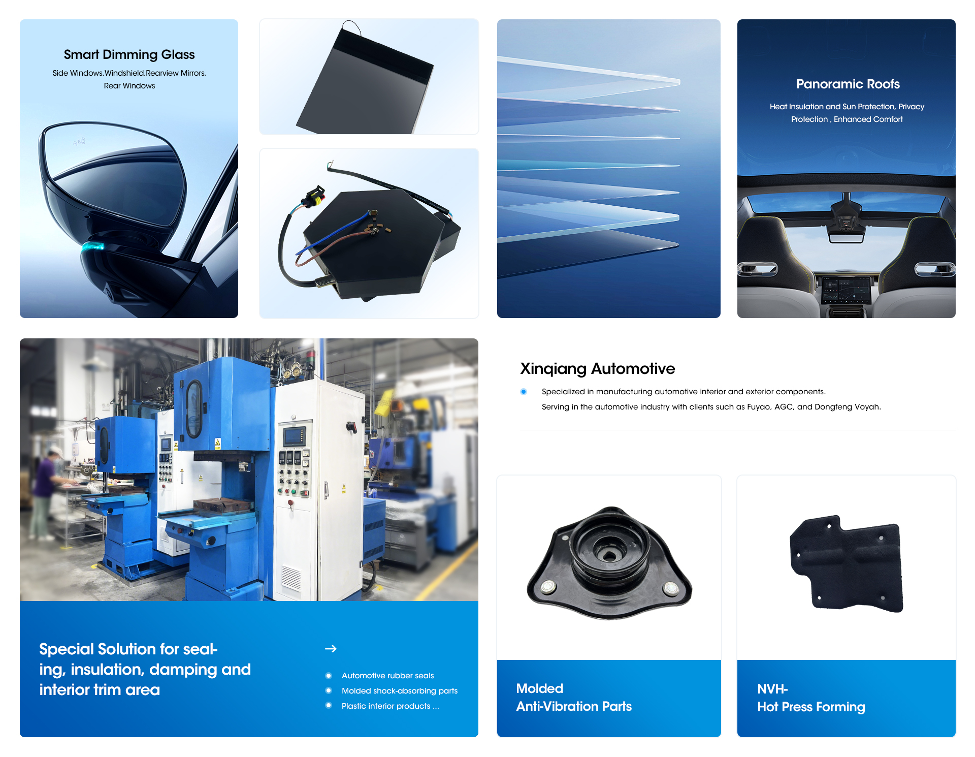 Automotive rubber seals, moulded shock absorbers, plastic interior trim parts, glass colour change controllers, automotive aluminium brackets, and other automotive interior and exterior trim parts.